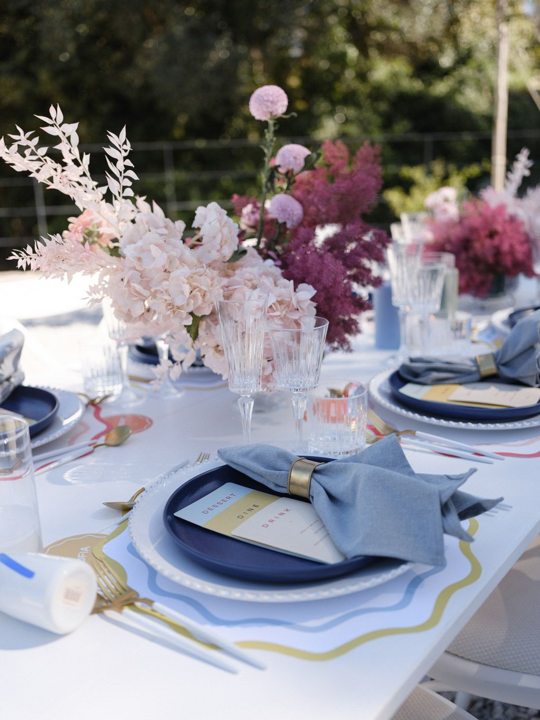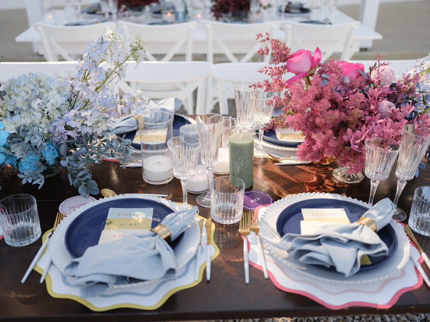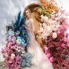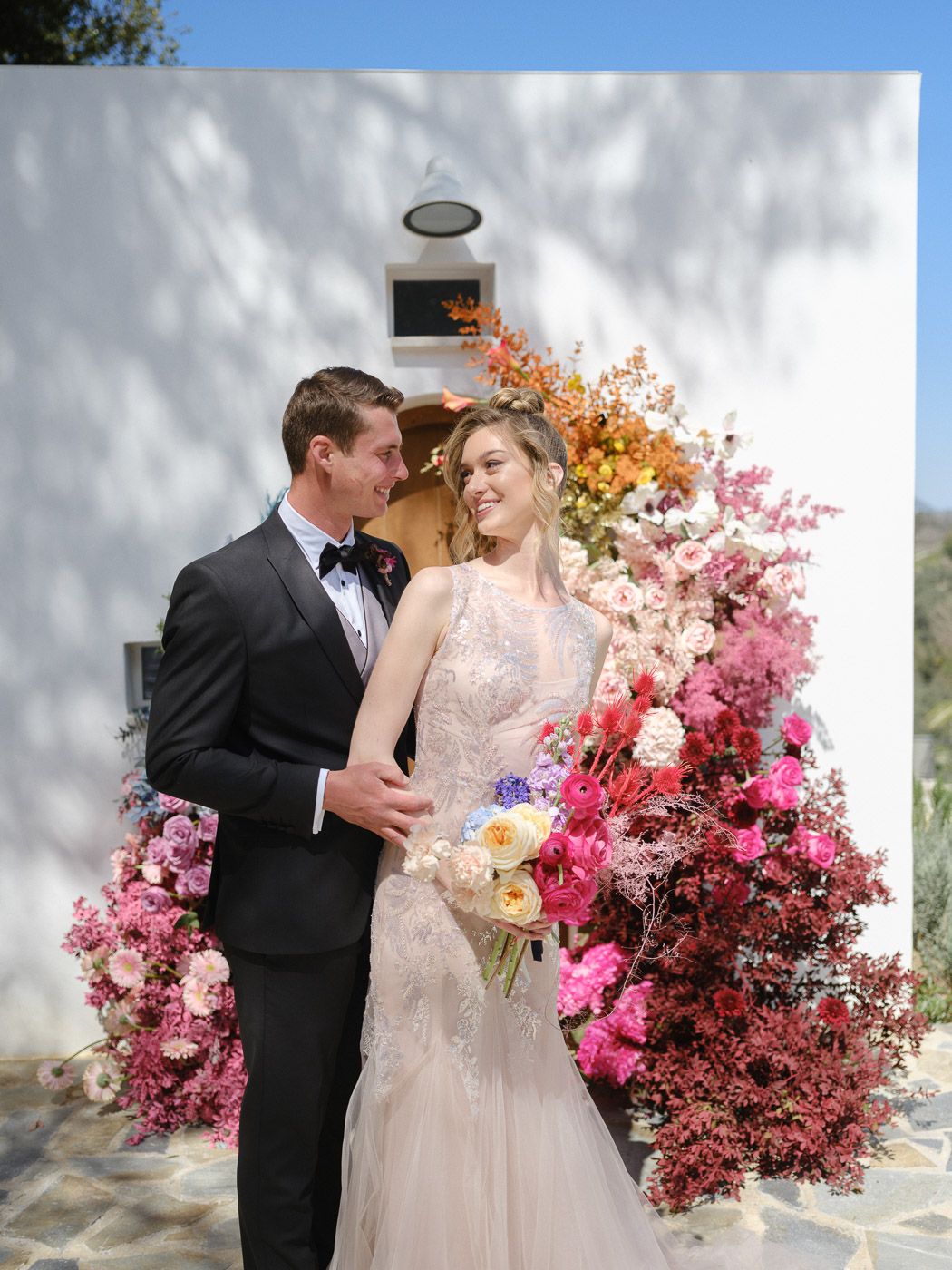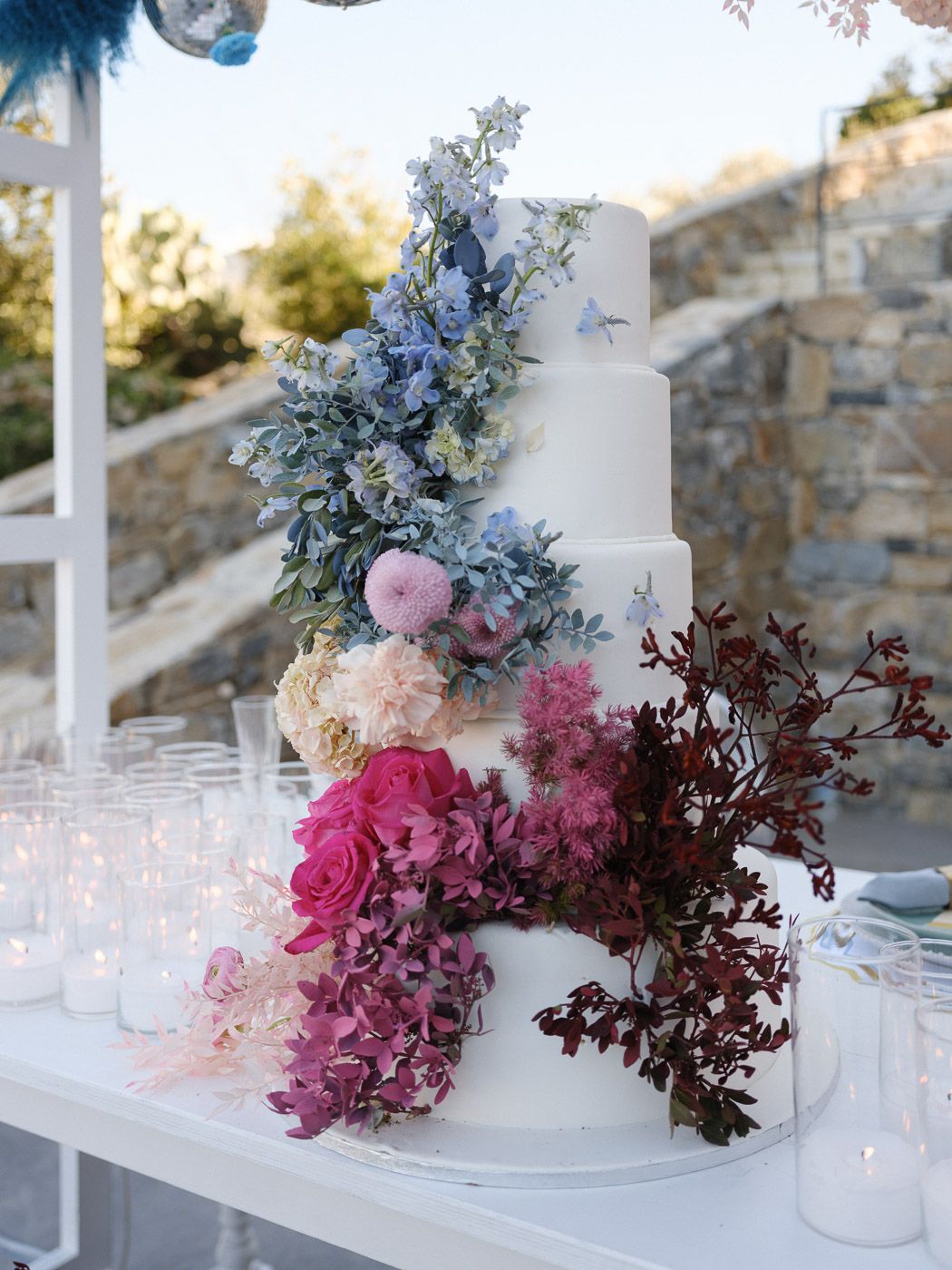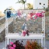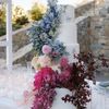 In this enchanting floral showcase, delicate blossoms cascade in a stunning array of pinks, purples, and deep reds, creating an ethereal backdrop for a moment of elegance and romance. The vibrant hues of the flowers stand out against the crisp white Mediterranean-style setting, evoking a sense of timeless beauty. Each bloom is meticulously arranged, showcasing the artistry and vision of bespoke floral design. The interplay of natural light dancing across the scene adds a touch of magic, ensuring that every detail invites admiration and adds to the harmonious, yet bold aesthetic.