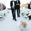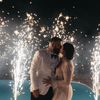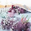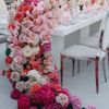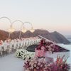 A vision of elegance unfolds under a canopy of ethereal blue foliage, accented with white blooms, creating a stunning backdrop for a couple standing in harmonious contrast. Their attire, a dance of monochrome elegance, complements the serene ambiance, while the azure sky and distant cliffs whisper of a hidden paradise. The floor is adorned with cascading white roses, framing the scene with pure grace. The location, with its tranquil vibes and breathtaking views, enhances the overall aesthetic, showcasing a perfect blend of nature and sophistication. This breathtaking display captures the essence of a dreamlike celebration, elevating the floral artistry to new heights.