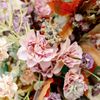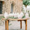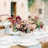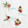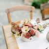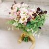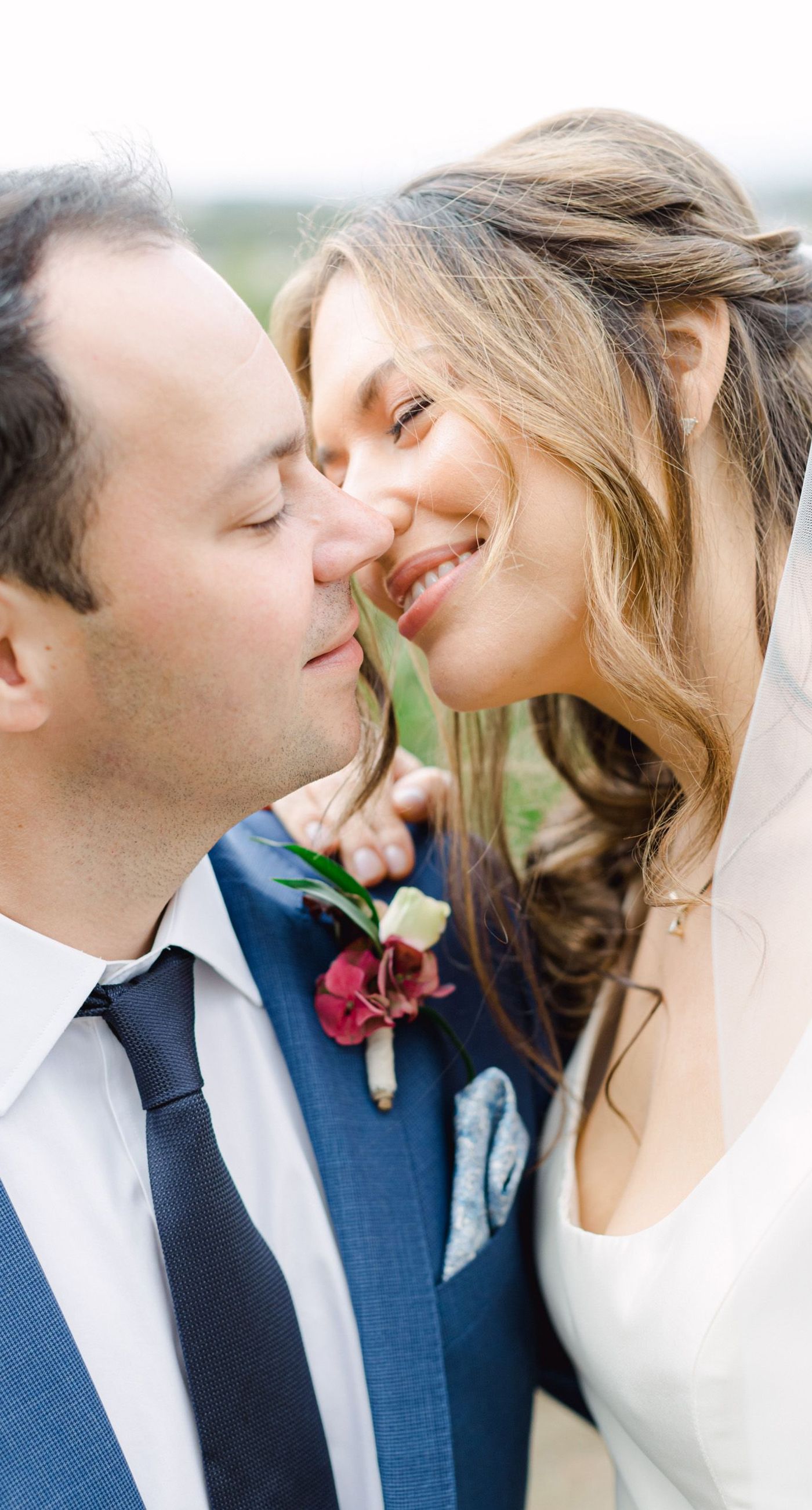 In an elegant dance of romance and subtlety, a couple is enveloped in a moment of intimate anticipation. Their surroundings whisper of nature's abundance, while the soft, muted colors of the bouquet enhance the gentle harmony between the blue suit and white gown. The florist's artistry is evident in the meticulous arrangement of delicate blooms and verdant leaves, highlighting the signature flair for understated sophistication. This serene union of floral grace and human connection brings forth an aesthetic that is both timeless and heartwarming, ideal for a setting that celebrates love and nature in its simplest form.