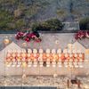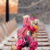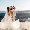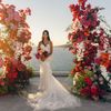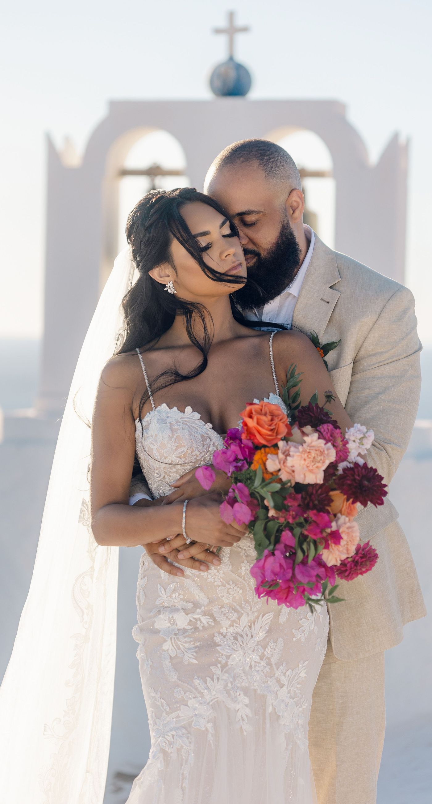 In a dreamlike setting beneath the soft embrace of the sun, this captivating work embodies a perfect union of elegance and romance. The delicate lace of her gown interlaces with the tender embrace of her partner, creating an ethereal atmosphere amidst the tranquil architecture. A vibrant bouquet bursts with life, featuring an exquisite medley of fuchsia, orange, and deep crimson blooms, each petal whispering tales of timeless love. The muted tones of the setting contrast beautifully with the vivid flowers, offering a glimpse into a serene world where artistry and nature harmonize flawlessly. This presentation speaks to the profound beauty that can blossom in moments of connection.