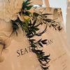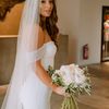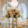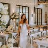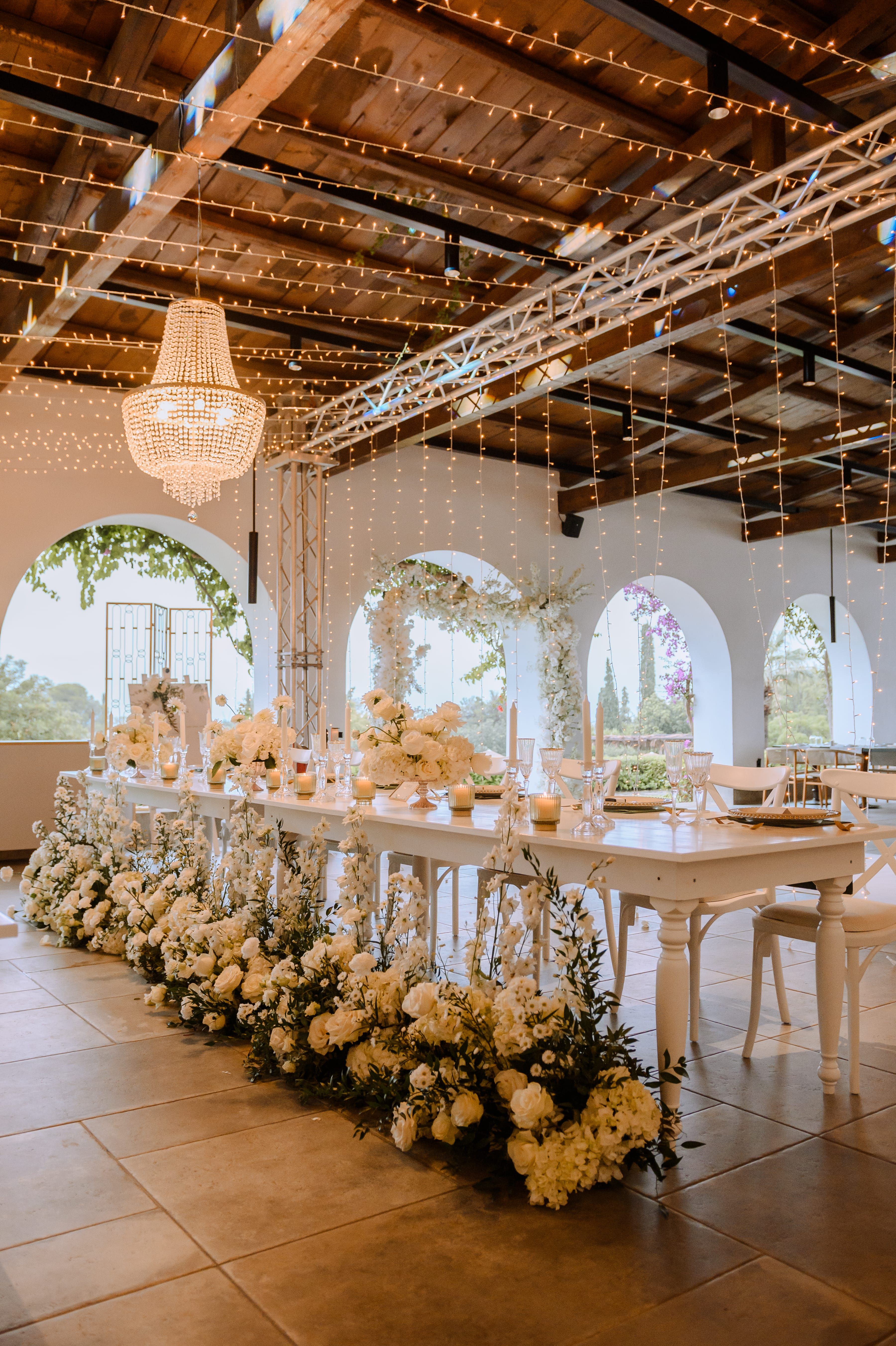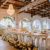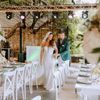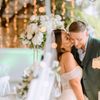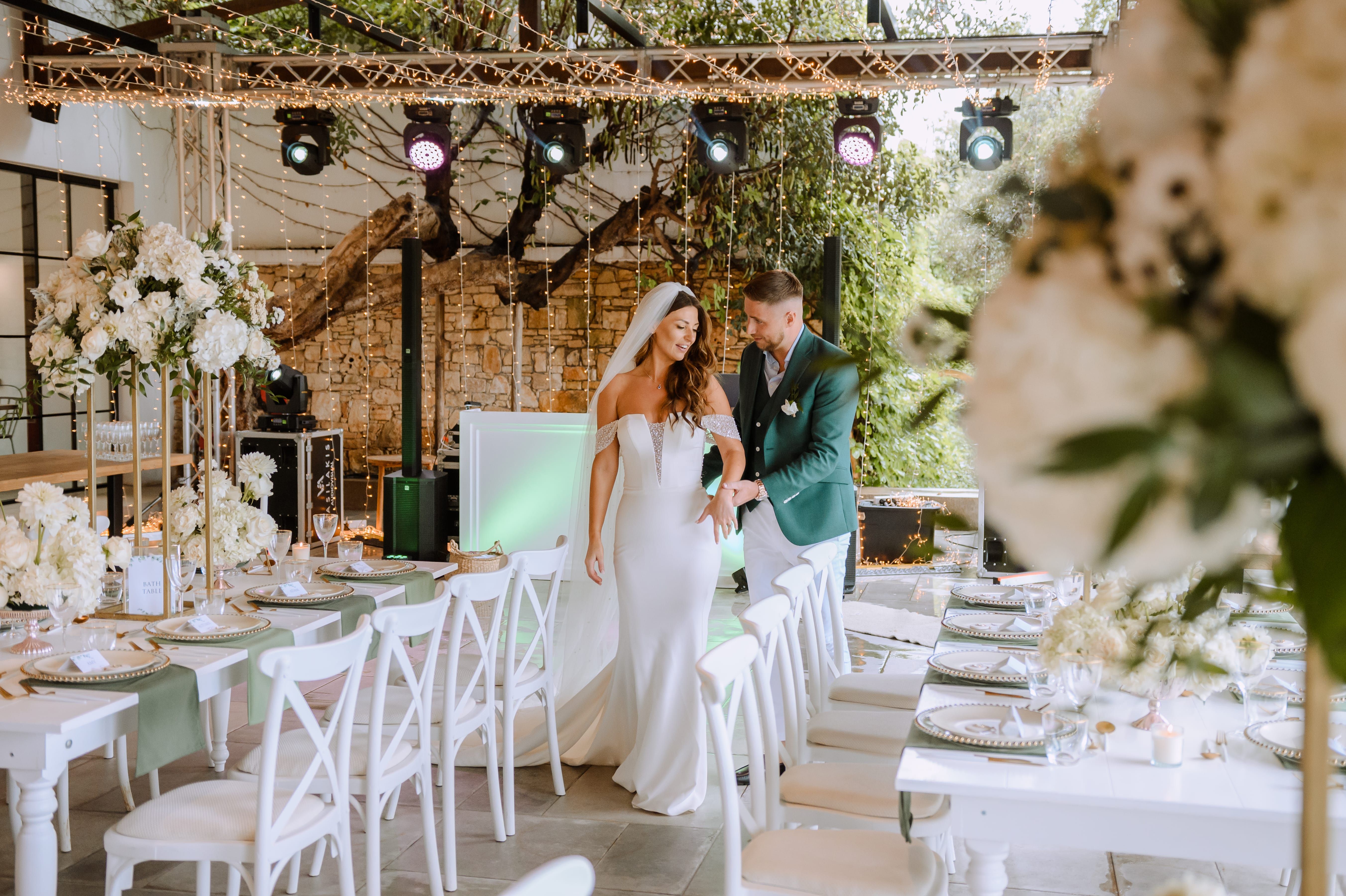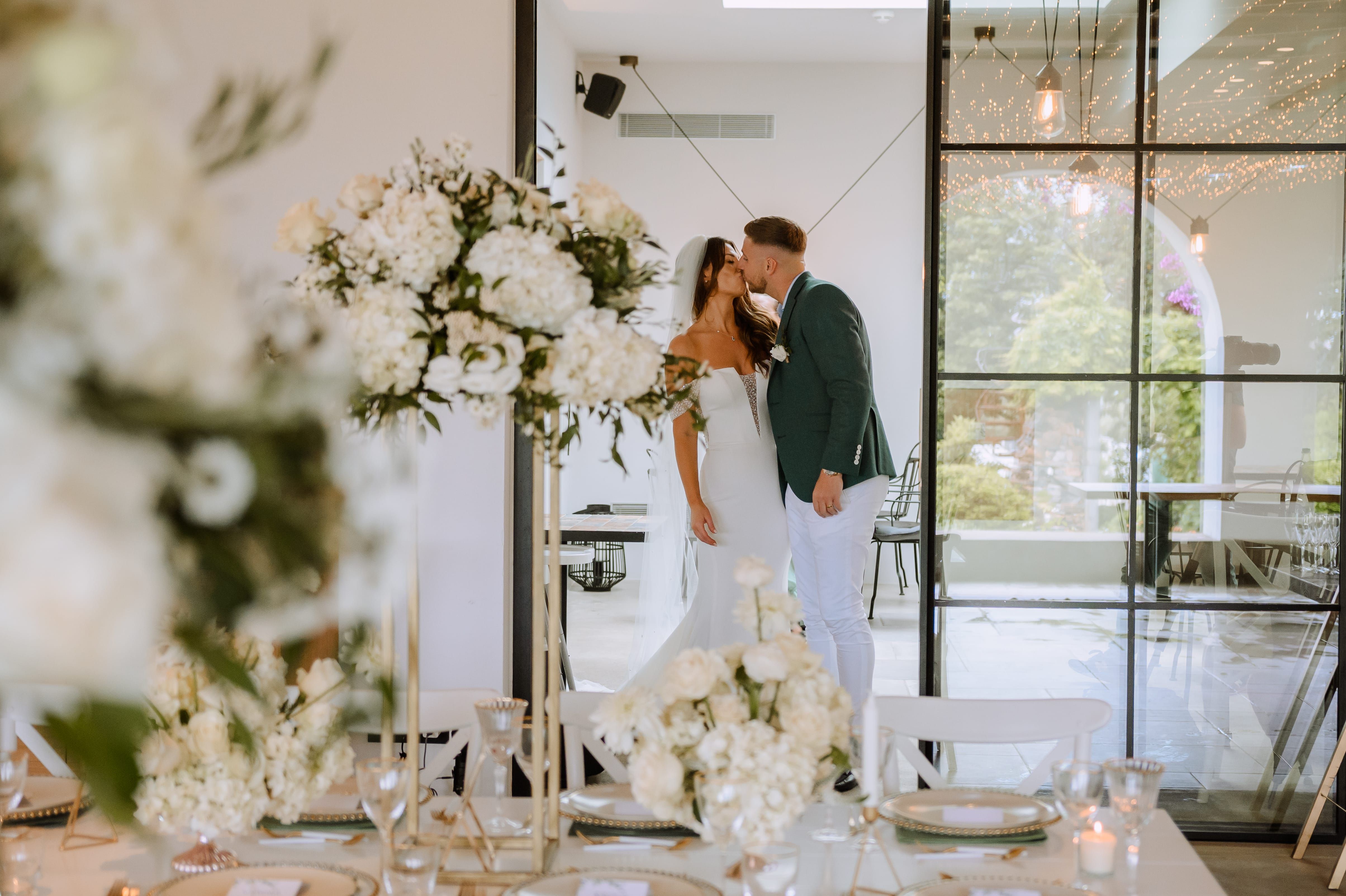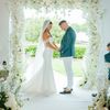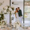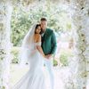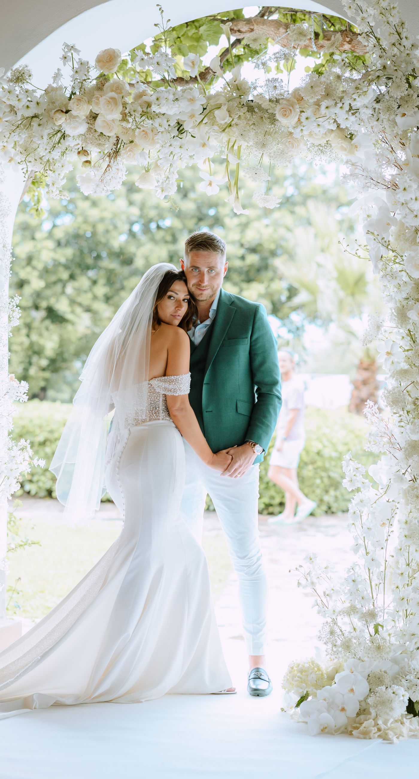Under a delicate floral arch, adorned with lush white blossoms and greenery, stands a vision of elegance and romance. The gentle pastel hues of the surrounding florals beautifully complement the soft, ethereal ambiance of this enchanting scene. It feels as though nature itself has been curated to frame a moment of serene connection, blending seamlessly into a verdant backdrop. The contrast of the bride's exquisite, flowing gown with the groom's tailored, modern attire in shades of emerald and white speaks volumes of both tradition and contemporary flair. This work captures an essence of timeless beauty, harmoniously blending natural elements with sophisticated design.