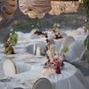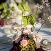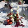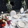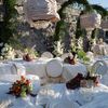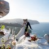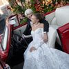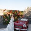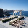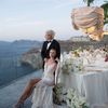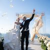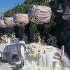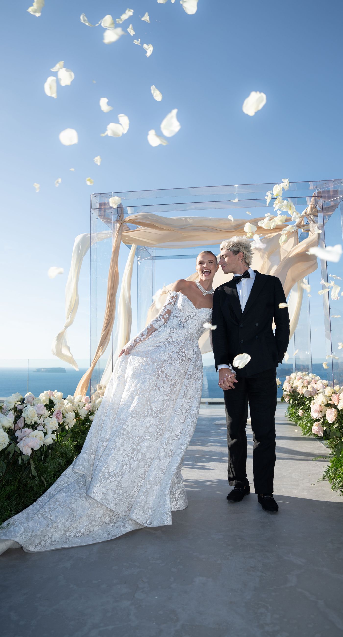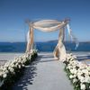 Under a clear blue sky, what unfolds is an ethereal expression of elegance and romance. The serene backdrop of vast, azure waters beautifully contrasts with the soft, delicate whites of the cascading petals, creating a scene both harmonious and enchanting. Meticulously arranged roses in gentle pinks and creams line the path, complementing the timeless lace and flowing structure of the bride's gown, while the groom's classic black suit adds a touch of refined sophistication. The graceful drapery, kissed by the gentle breeze, frames this moment of joy and forms a masterpiece of floral artistry, balancing nature's serenity with bridal grandeur.