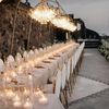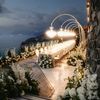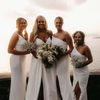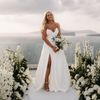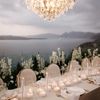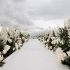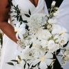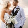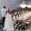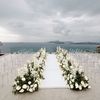 Amidst a backdrop of oceanic vistas, the couple's radiant joy is accentuated by a floral pathway of elegant white blooms, creating an ethereal blend of romance and sophistication. The bride’s flowing gown mirrors the gentle waves beyond, while the groom’s crisp white suit with contrasting black accents adds a touch of modern elegance. The scene conveys a serene yet vibrant celebration, encapsulated by the natural light that washes over the space, infusing it with a warm, golden hue. This harmonious composition captures the essence of a perfect union, where nature and love intertwine seamlessly.