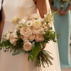 In this captivating scene, the essence of love and nature come together harmoniously, as the gentle sunlight filters through the trees, casting a warm and inviting glow. A bouquet bursts with life, showcasing a rich tapestry of soft ivory and blush roses, complemented by delicate greenery. The elegant arrangement, full of texture and subtle vibrancy, perfectly captures the serene ambiance of this outdoor setting. Every element speaks of artistry and romance, making it a quintessential addition to a florist's portfolio, where nature's beauty and human emotion intertwine seamlessly.