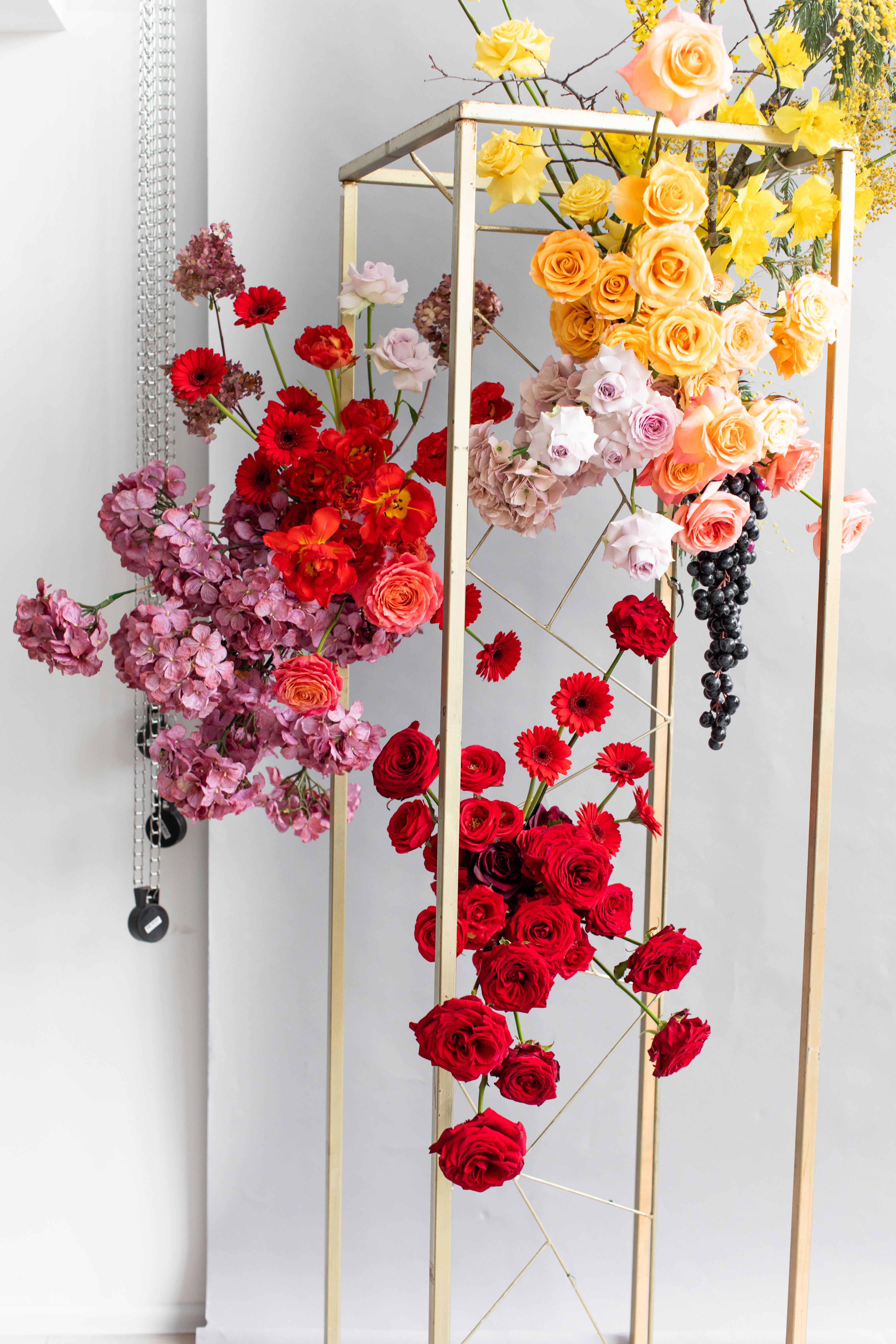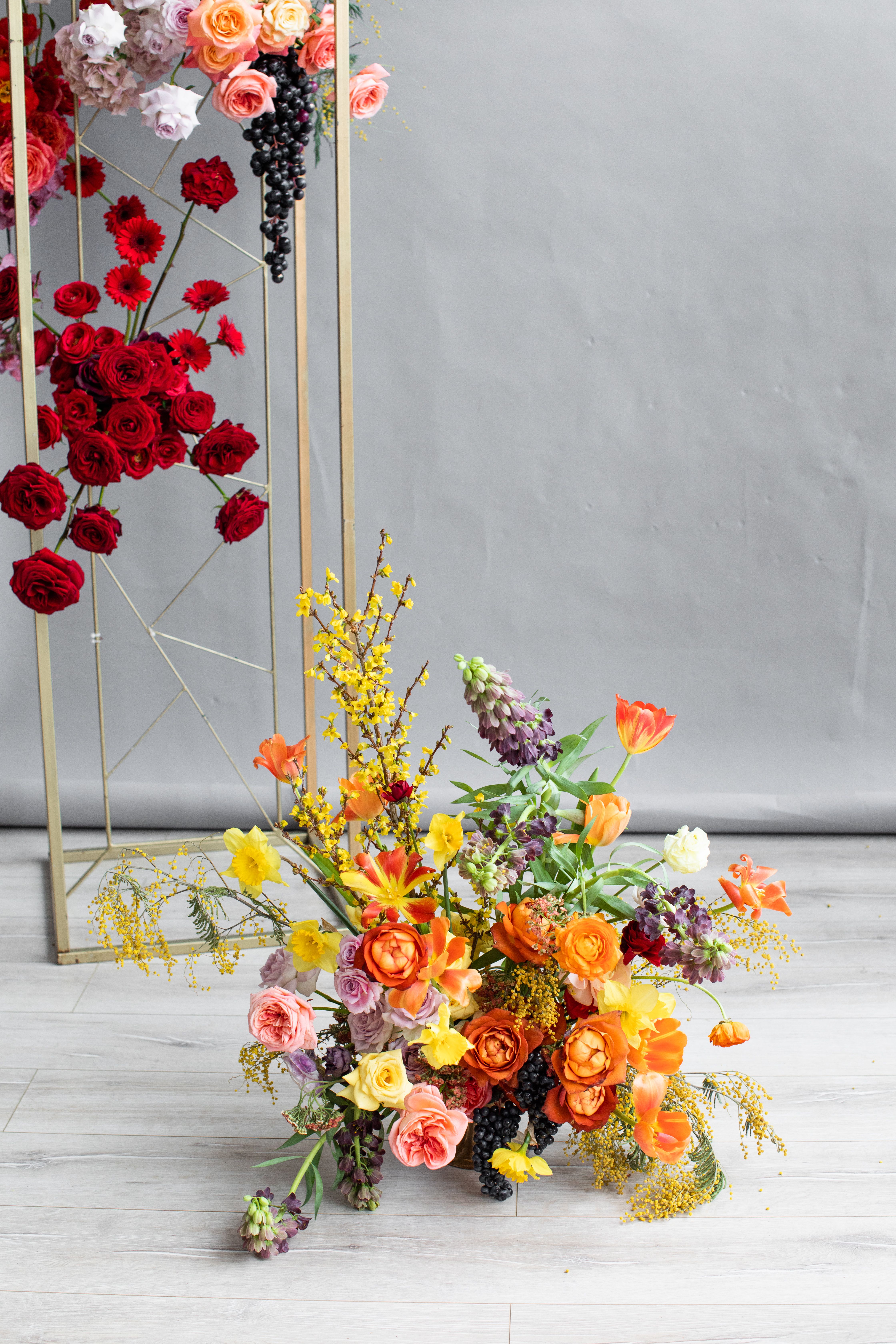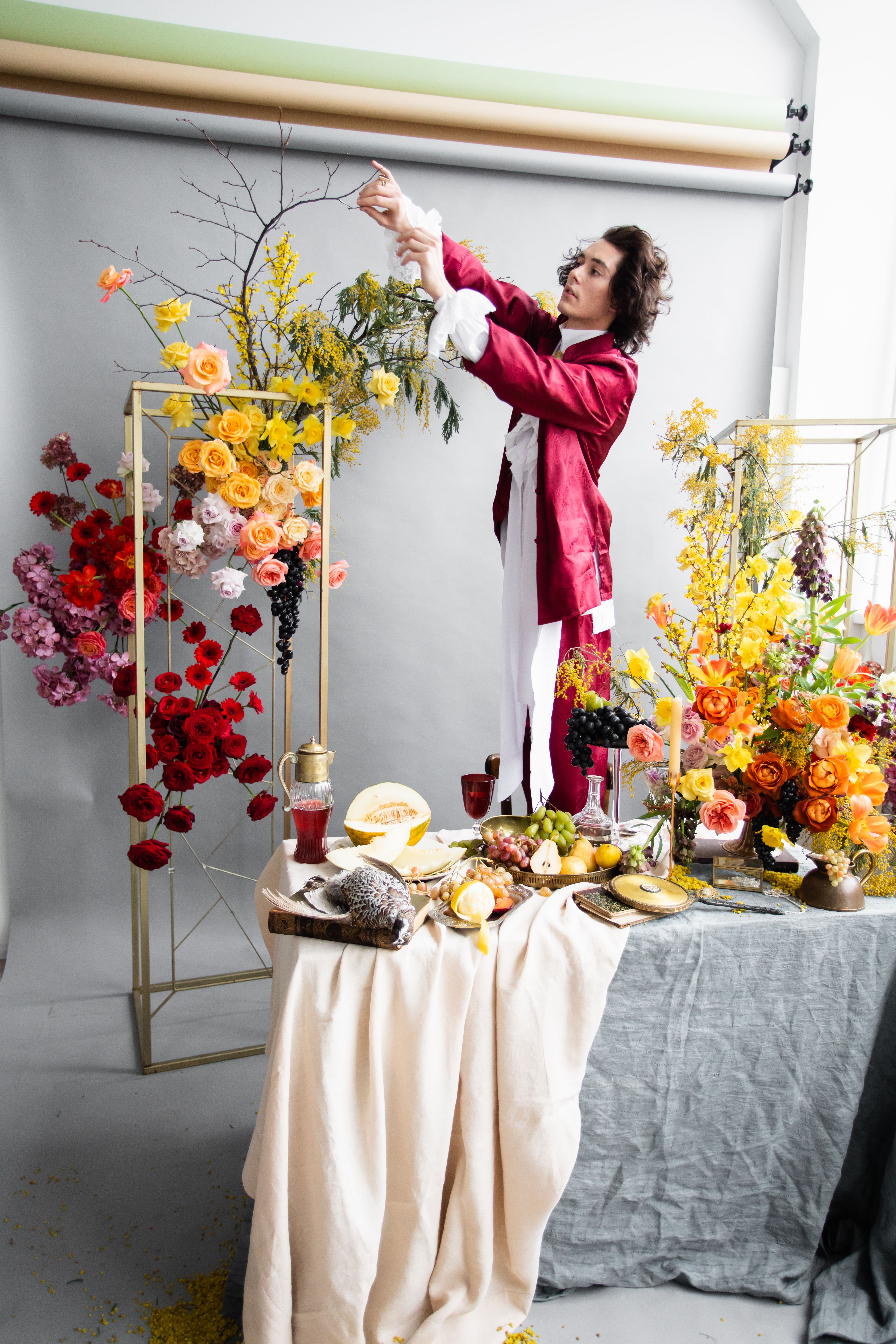 In a symphony of colors, this floral arrangement weaves together vibrancy and elegance, creating an aesthetic that feels both timeless and contemporary. The vivid reds, yellows, and oranges of the blooms contrast strikingly against a soft, neutral backdrop, while a rich, wine-colored robe adds a touch of opulence. Surrounded by a lush abundance of fruits and elegant tableware, the setting evokes a sense of refined abundance, as if captured in a modern-day still life. The arrangement harmoniously balances the natural and the curated, transforming the space into a living work of art, and serving as a striking centerpiece for a florist's creative portfolio.