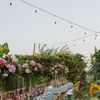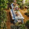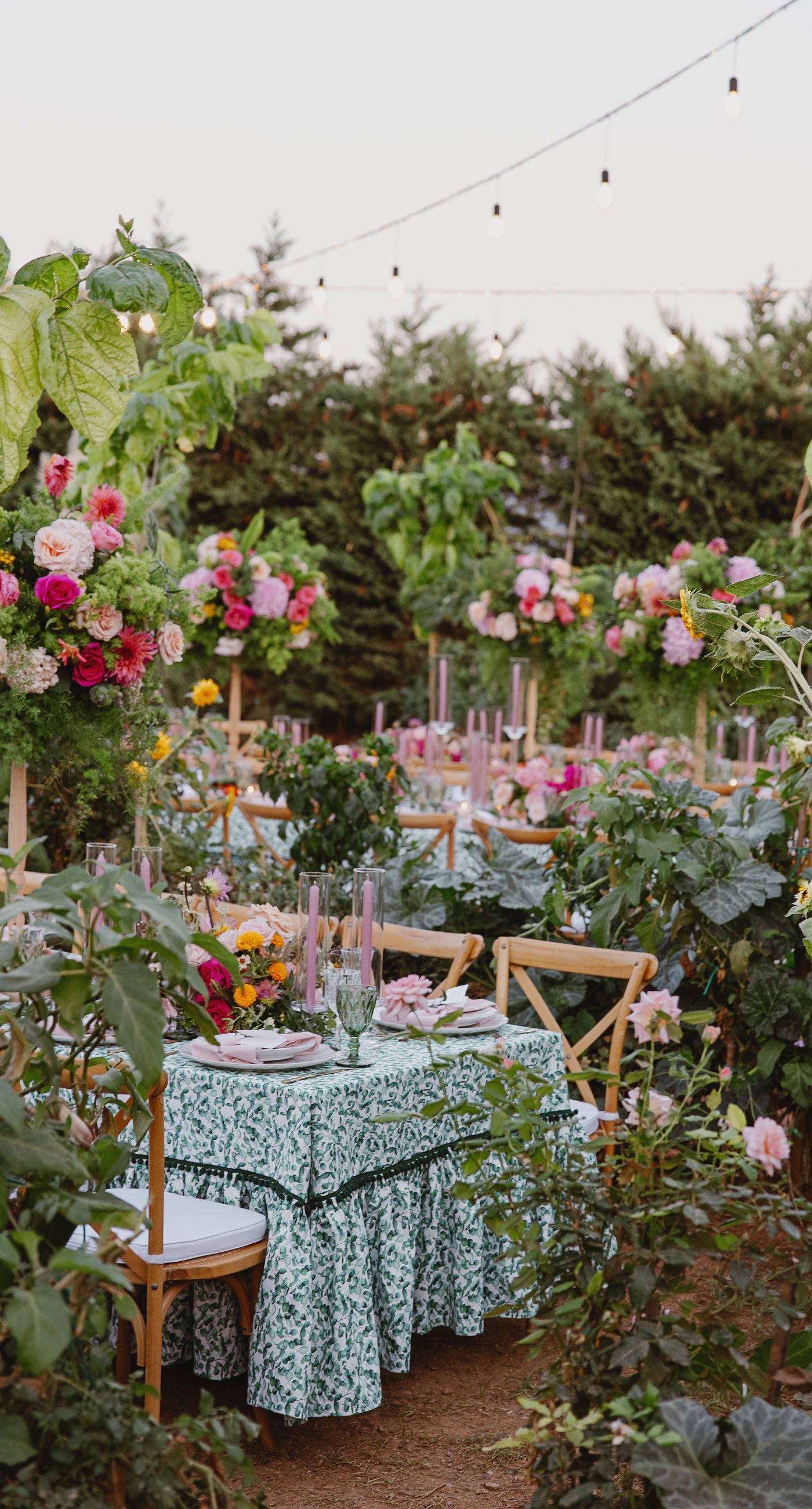 A modern garden wedding with clean lines and a strong sense of a curated dining experience. Long communal tables set within the vineyard, statement floral arrangements at varying heights, layers of greenery with bold color accents, and warm lighting that carried the atmosphere from day into night. A setting that felt natural yet intentionally designed contemporary, vibrant, and effortlessly elegant.